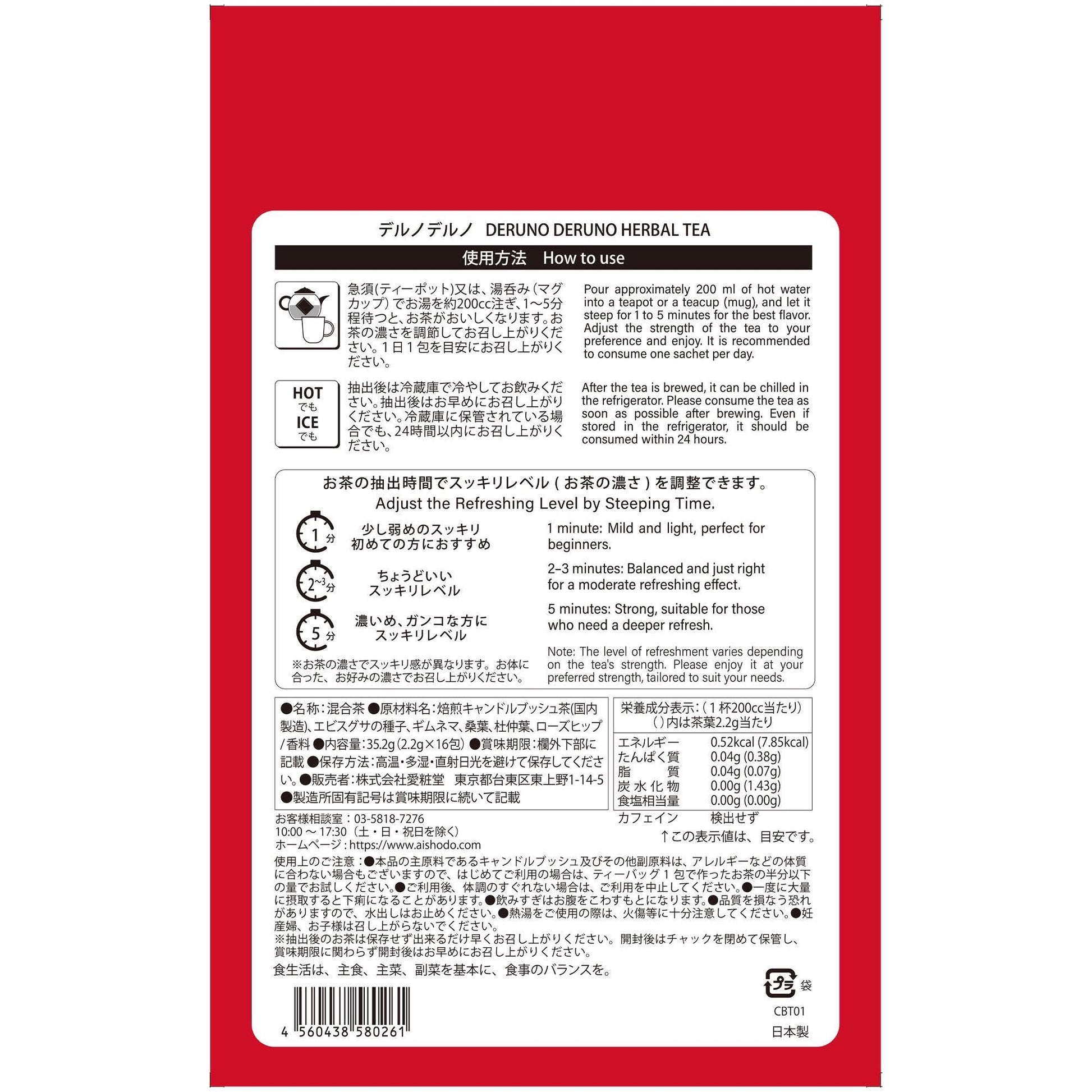 Một tách trà Thảo mộc giảm cân Deruno chứa những thành phần đã được tính toán cẩn thận của công ty sản xuất Showa Pharmaceutical, là công ty Dược phẩm chuyên sản xuất về các sản phẩm giảm cân sẽ mang lại cho bạn sự giảm cân qua việc thanh lọc đường ruột cân bằng giữa việc “ nhận thực phầm vào và đào thải “, giảm mỡ thừa và giảm Cholesterol xấu.